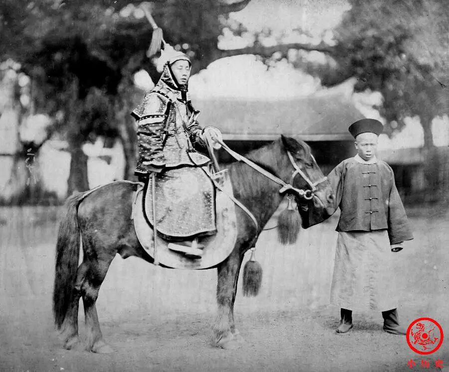 这名武官身穿清军铠甲,骑在一匹矮马上,还有一位护卫随侍,但他没有塑造出威风凛凛的形象。在晚清热兵器时代,铠甲已经难以抵挡枪炮的袭击,实战价值大大降低。事实上,清朝中期以后,士兵在实战中不穿铠甲成为常态。