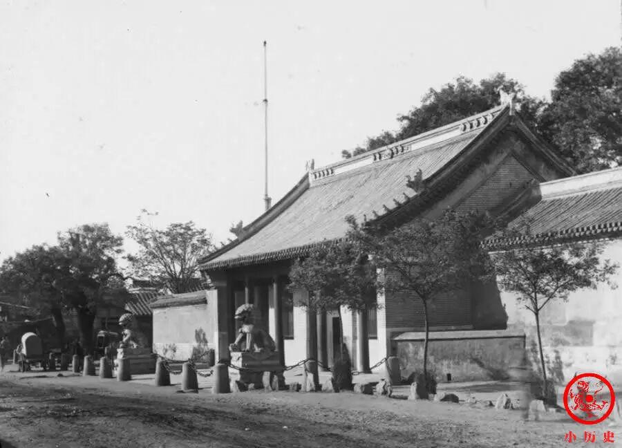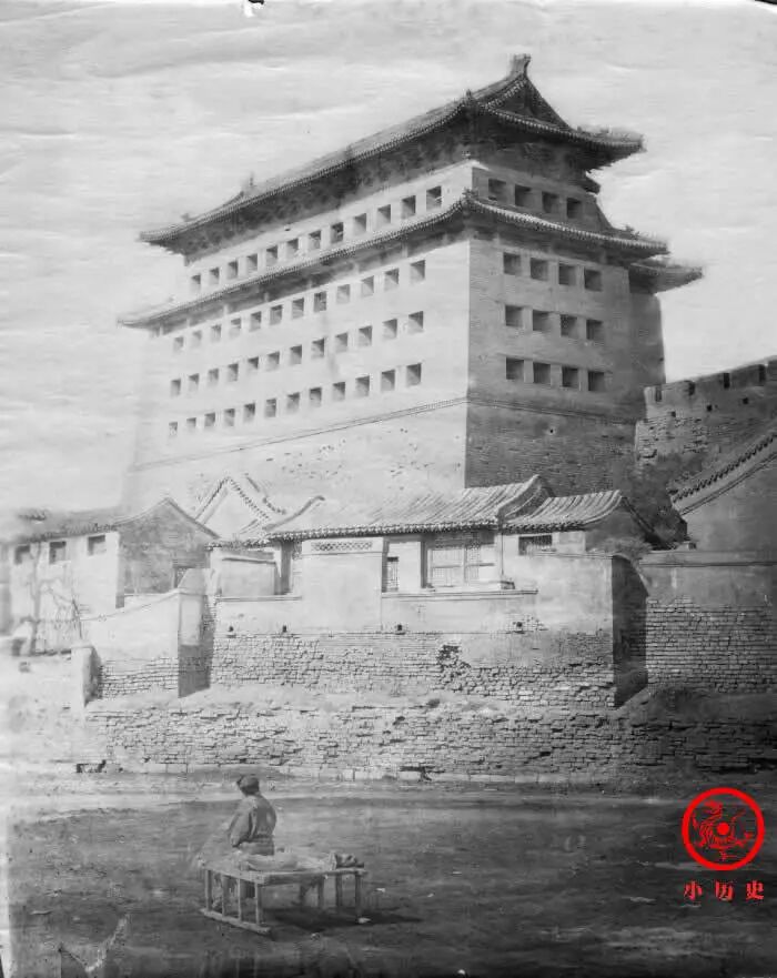 照片在结冰的护城河上拍摄,记录了崇文门箭楼高大巍峨的身影。1900年庚子事变中,英军用炮火炸毁了这座箭楼,事后重建。