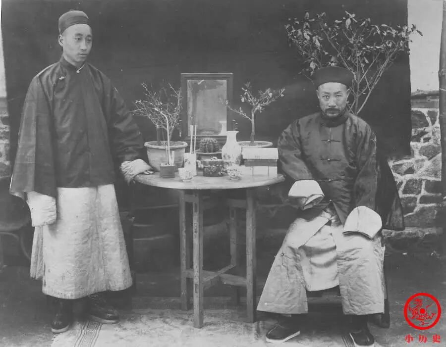 父子二人精心设计了拍照布景,在茶几上放了很多东西作陪衬,有烟斗、有书籍、有茶碗、有花瓶、有盆景等等,其中最吸引我注意的,还是那盆仙人球。我以为养殖多肉植物是近几十年来兴起的,原来早在100多年前(甚至更早)就已经进入家庭生活了。