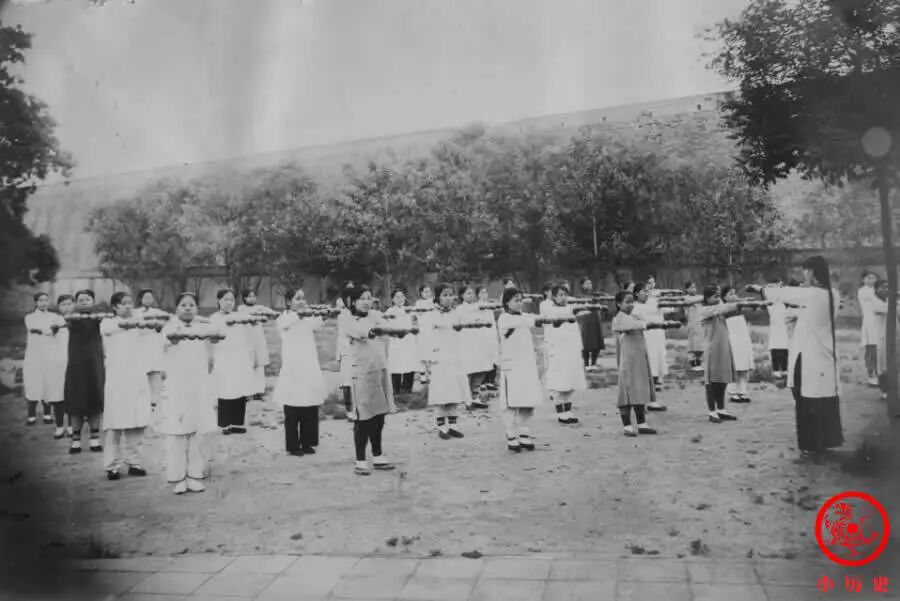 这些学生托举重物,锻炼手臂的力量。清朝女性一般不会参加体育活动,否则就可能被认为疯疯癫癫、不守女德,而且大多数女性缠足,也没法做运动。到了晚清以后,随着新思想的传入和新式学堂的建立,女孩子才慢慢开始参加户外运动强身健体。