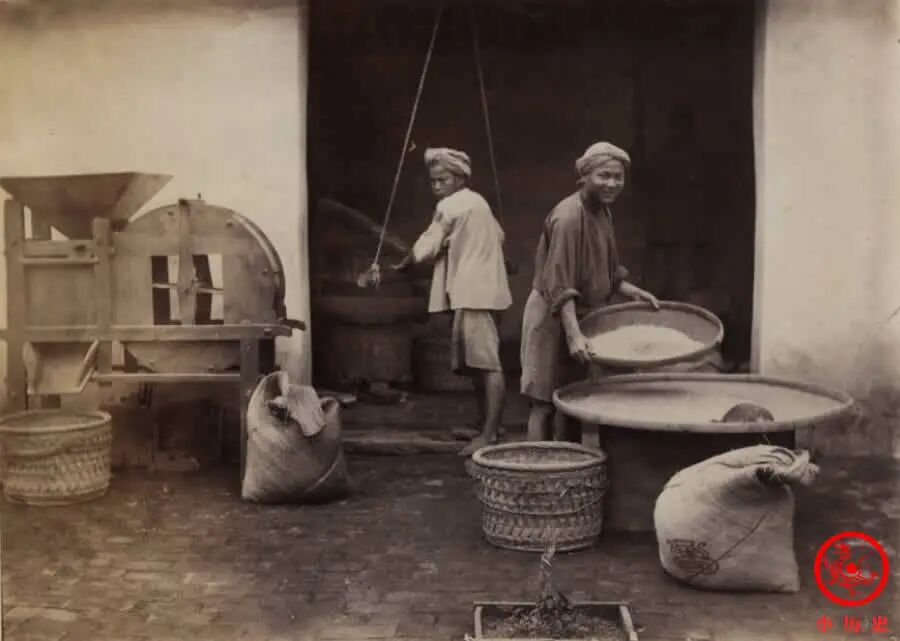 稻谷脱壳之后形成“糙米”,糙米用来煮饭的话口感不好,不利于消化,因此还需要一个碾米工序,把糙米碾成光洁的精米,这样就能用来做饭了。随着科技的发展,这种传统的处理方式早已隐入历史深处,画面中的风机也消失了。