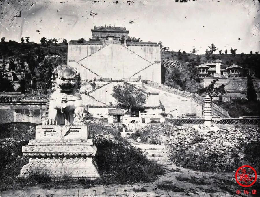1860年英法联军烧毁颐和园(当时还叫清漪园),此后数十年就处于废弃的状态。照片记录了万寿山南麓残破的建筑,原本巍峨的佛香阁已经化为灰烬,地面上废墟成堆、杂草丛生,一片荒凉的景象。直到1888年,慈禧太后为了安享晚年,又重修了颐和园。