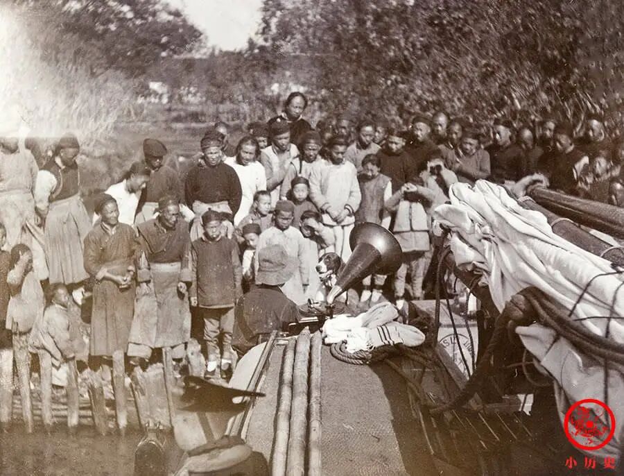 一名欧洲男子在船上用留声机播放音乐唱片,这对当时的百姓来说绝对是神奇的玩意儿,虽然他们难以理解,仍然阻挡不了他们的好奇心,大人孩子都一拥而上看热闹,围得里三层外三层。