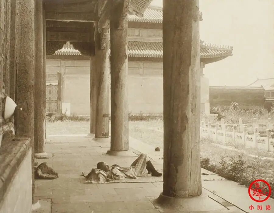 紫禁城内负责洒扫庭除的太监,显然在主子逃跑后已经没有了责任心,不再顾及维护皇家体面。慈禧太后在的时候,对太监的管束特别严格,谁敢四仰八叉地在殿宇之下躺着?太后遭难,权威削弱,太监管理体系也崩溃,这类不雅观的事就不可避免地出现了。