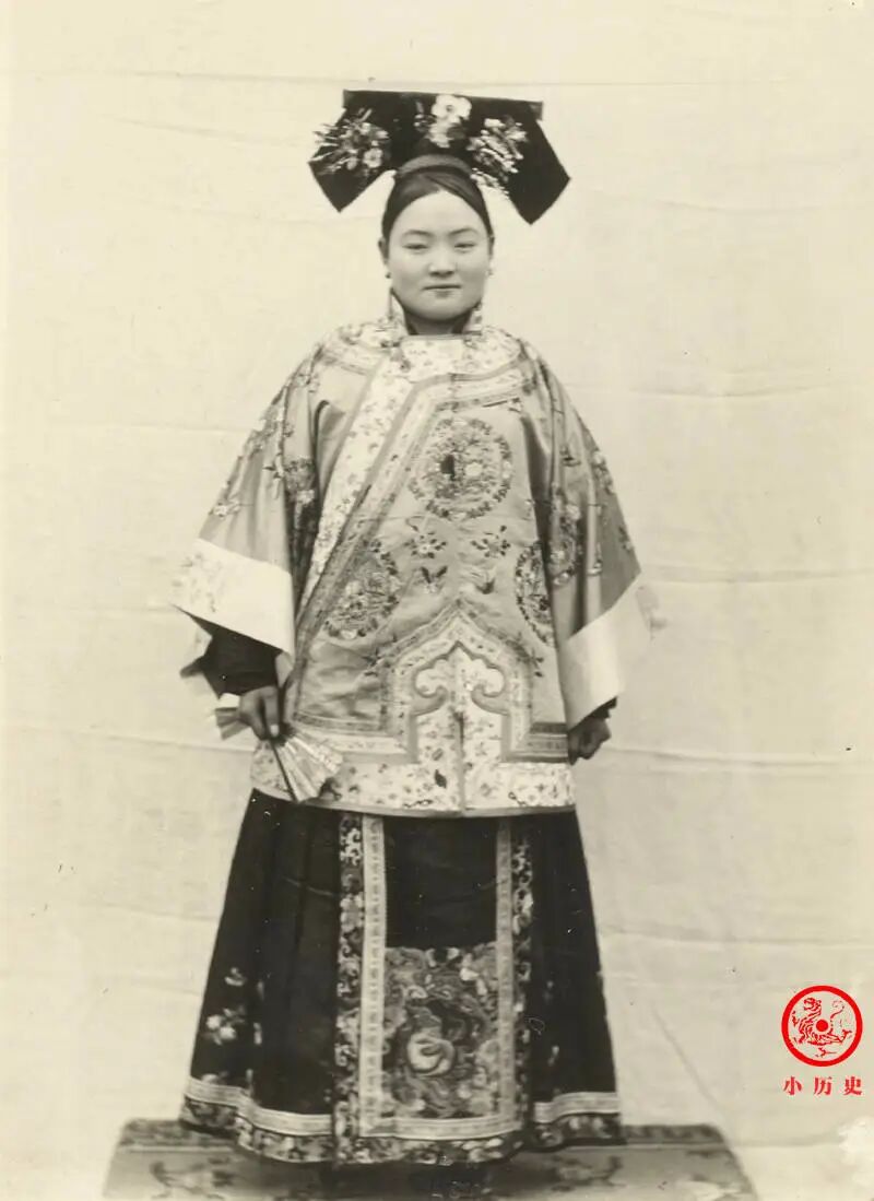 这位女子头戴“大拉翅”、上身穿褂子,是旗人贵妇的典型风格。不过,她下半身穿马面裙,很明显又是汉族妇女的服饰。她身上体现出晚清时期普遍存在的满汉交融的特点。