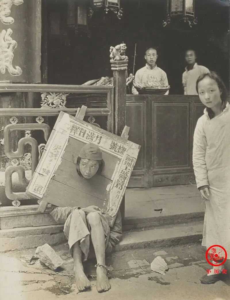 枷板上的字样表明,杭州上城警察局判了他半个月的戴枷示众刑罚。左侧字条还写着他的姓名和所犯罪行,可惜字迹模糊难以辨认。