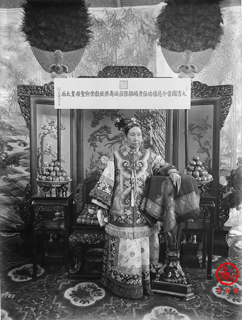 照片中的慈禧太后衣着精美、装扮精致,面部没有笑意,脸色阴沉、凶相毕露,随时可能大发雷霆。她性情古怪、喜怒无常,身边的太监、宫女如有失误,往往遭受很重的惩罚。
