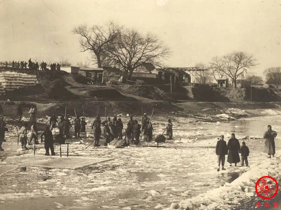 采冰这一传统历朝都有,一般在农历的十二月和正月天气最冷的时候进行。工人用T形冰镩在冰冻的河面上一点点凿出方形冰块,再用勾子拉出来。采好的冰马上送冰窖储藏,等来年夏天卖给富贵人家降温纳凉。