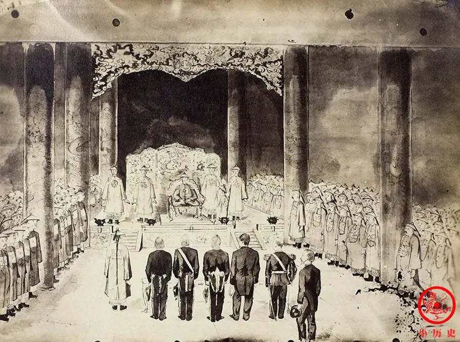 1873年6月29日,恭亲王奕訢带领各国外交代表进入西苑紫光阁,同治皇帝在此会见了他们。清朝海关外籍职员托马斯·查尔德拍摄了这个场景,但照片已不存,英国档案馆保存了根据他的照片绘制的复制品。