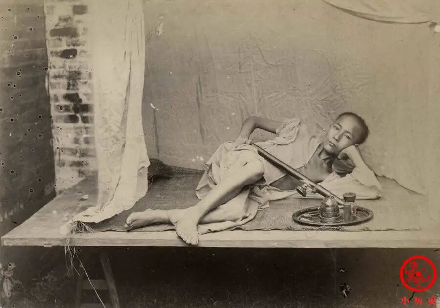 我们在中学历史课上学到过,鸦片深深毒害了晚清社会,加剧了积贫积弱的局面,这张照片就是一个缩影。一个青年躺在木板床上,身边放着烟灯、烟枪等工具,眼神迷离,似乎刚刚过完瘾。据《慕雅德眼中的晚清中国》一书提供的数据,1880年代,清朝吸食鸦片的人数达到顶峰,在800万左右。