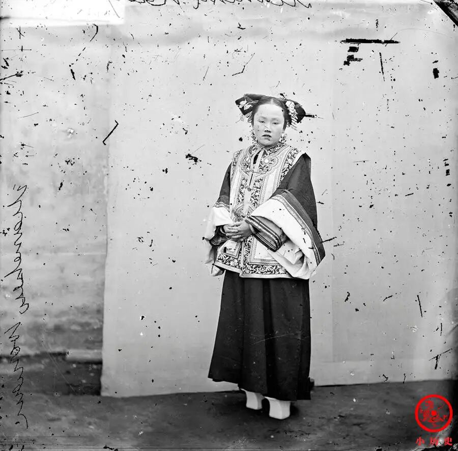 这名女子的发型和鞋子都引人关注。她的发型名为“两把头”,就是把头发束在头顶上,分成两绺,结成横长式的发髻,再将后面余发结成一个“燕尾”式的长扁髻,压在后脖领上。她的鞋子是“花盆底”鞋,旗人中青年女性普遍穿着,其鞋底一般高5-15厘米,最高的可达25厘米左右,类似现今的“恨天高”。