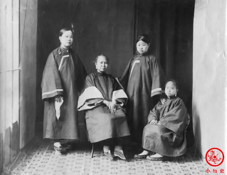 从着装、头饰来看,她们都是旗人。奇怪的是,坐着的那位老妇裹小脚、穿弓鞋。要知道,清朝历任皇帝均反对全体女性缠足,后来发现汉族女子缠足陋习根本禁止不了,只好严令旗人女子不得缠足,否则其父兄将受到惩罚。看来旗人女子也没有完全遵守谕旨。