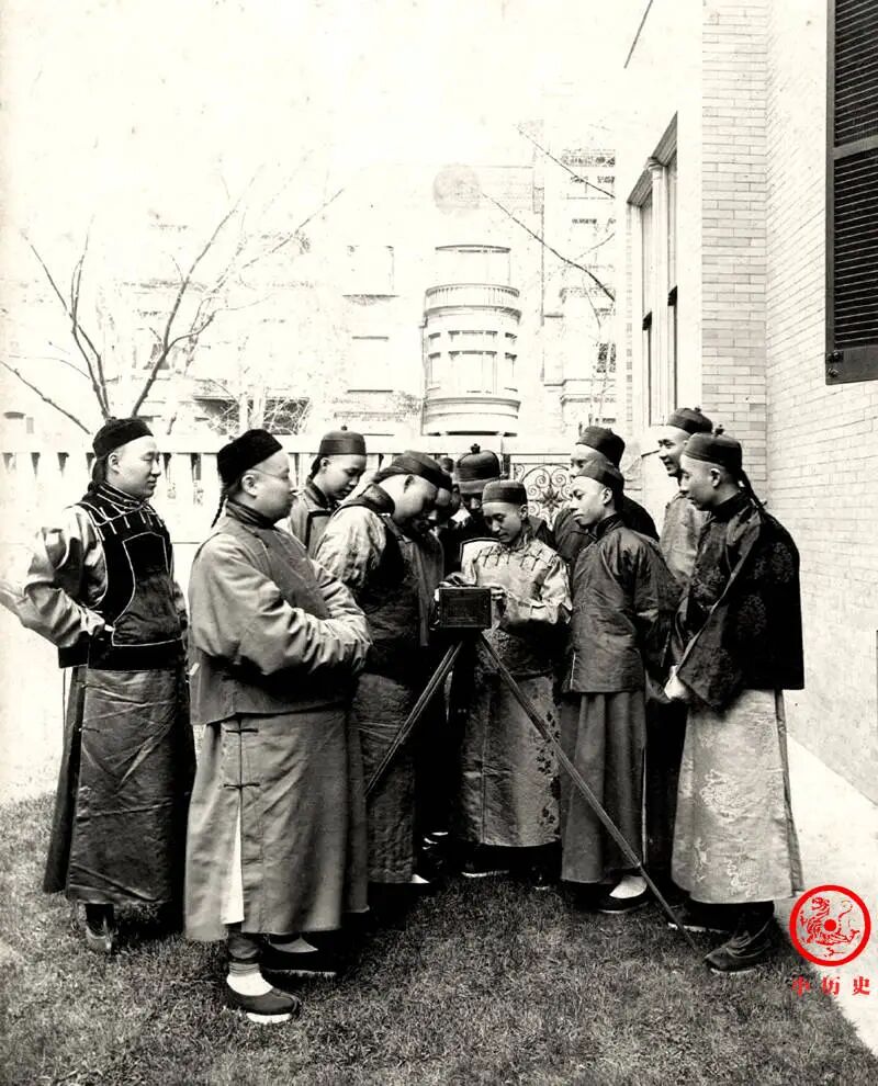 画面中,清朝驻美使署通译官钟文耀在给大家讲解照相机的使用方法。清朝末年,照相机越来越常见,但始终属于奢侈品,很多富贵之人都没见过。这张照片也透露出另一个信息,那就是人们对摄影术的态度,从最初的排斥转变为坦然接受,甚至好奇追捧。
