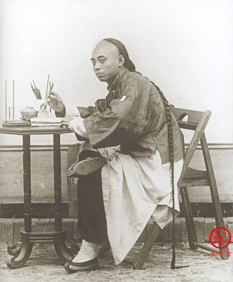 男子手持毛笔,翘着二郎腿,这不是写字的正确姿势,显然系摆拍而成。他的大辫子特别显眼,一直垂到地上。