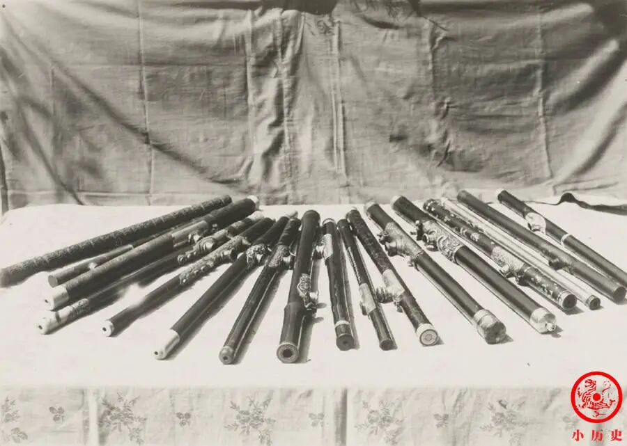 烟枪是吸食鸦片的主要工具,晚清的工匠在制作方面花足了心思。官吏、缙绅所用的烟枪较为名贵,有玉的、有象牙的、有金属的等等,还在上面镶嵌翡翠、宝石、玛瑙等物件以装饰。一般贩夫走卒用的烟枪只是竹制而已。
