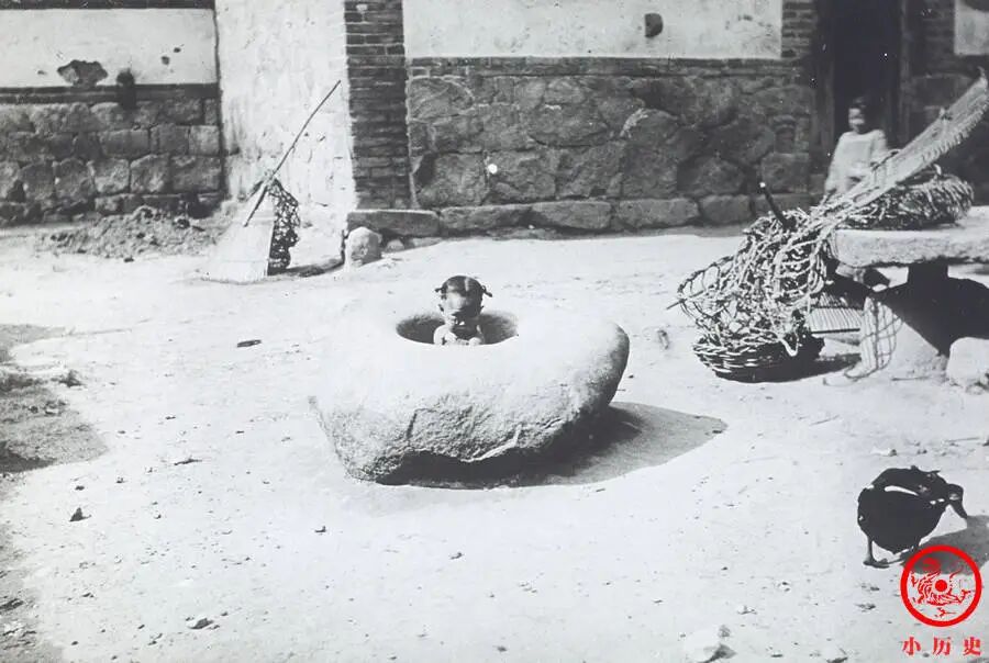 这一家有石砌的墙壁、干净的院落,生活条件还算不错。一个孩子坐在石臼里,特别可爱。