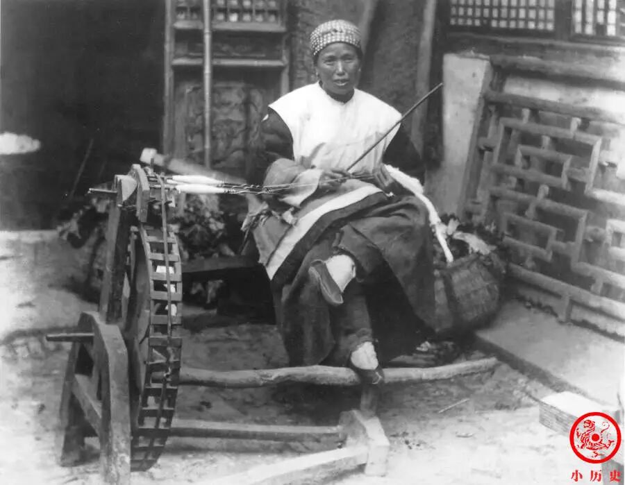 旧社会的劳动妇女很少外出谋生,在家承担着繁重的家务,熟练掌握各种女红技能,其中纺线是基本功之一。照片中这位妇女的纺车看上去很古老、很笨重,大概是世世代代传下来的。