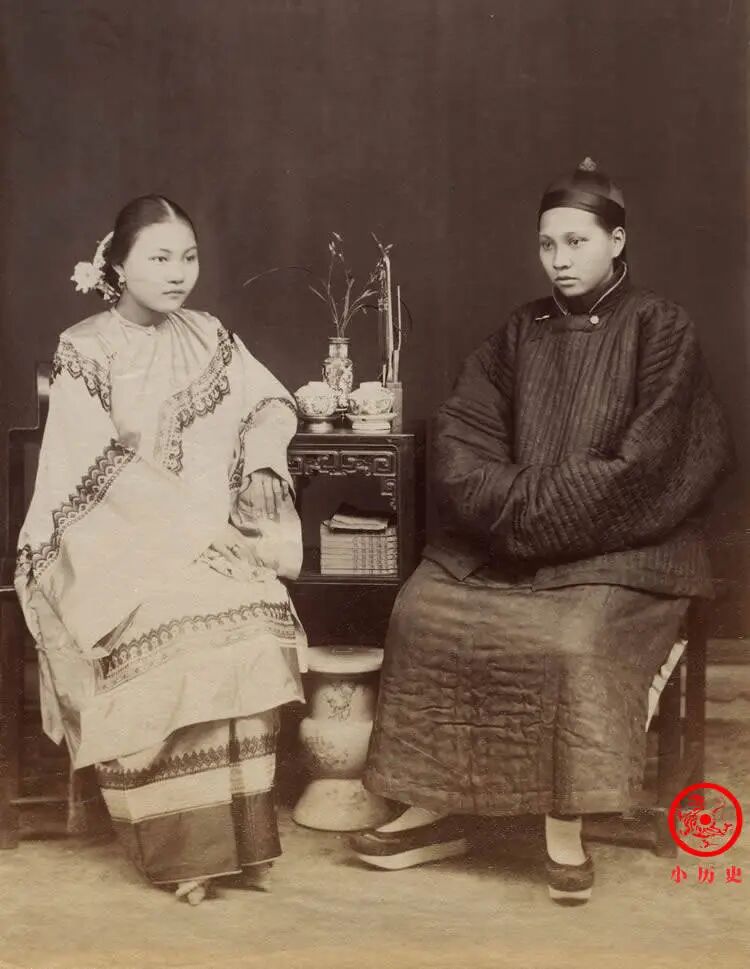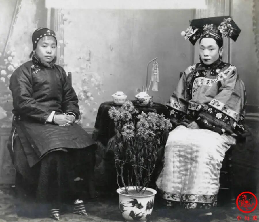 左边这位是裹小脚的汉人妇女,右边这位是头戴大拉翅的旗人妇女。她们能到照相馆拍合照,说明关系非常亲密。晚清时期,满汉之间的畛域不像以前那样泾渭分明,不仅交往越来越平等,到1901年之后也被允许通婚。