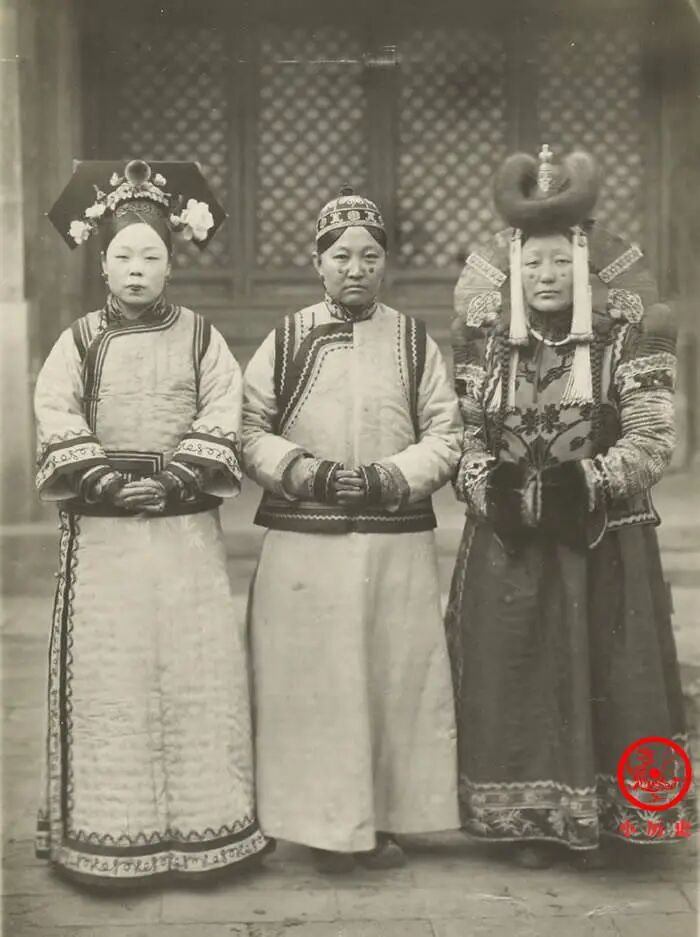 左一是满族旗人,左二、左三是蒙古旗人。通常我们认为旗人贵妇应该千娇百媚,实际上她们霸气外露。清朝满蒙之间过从甚密,很多皇室格格就嫁给了蒙古王公。