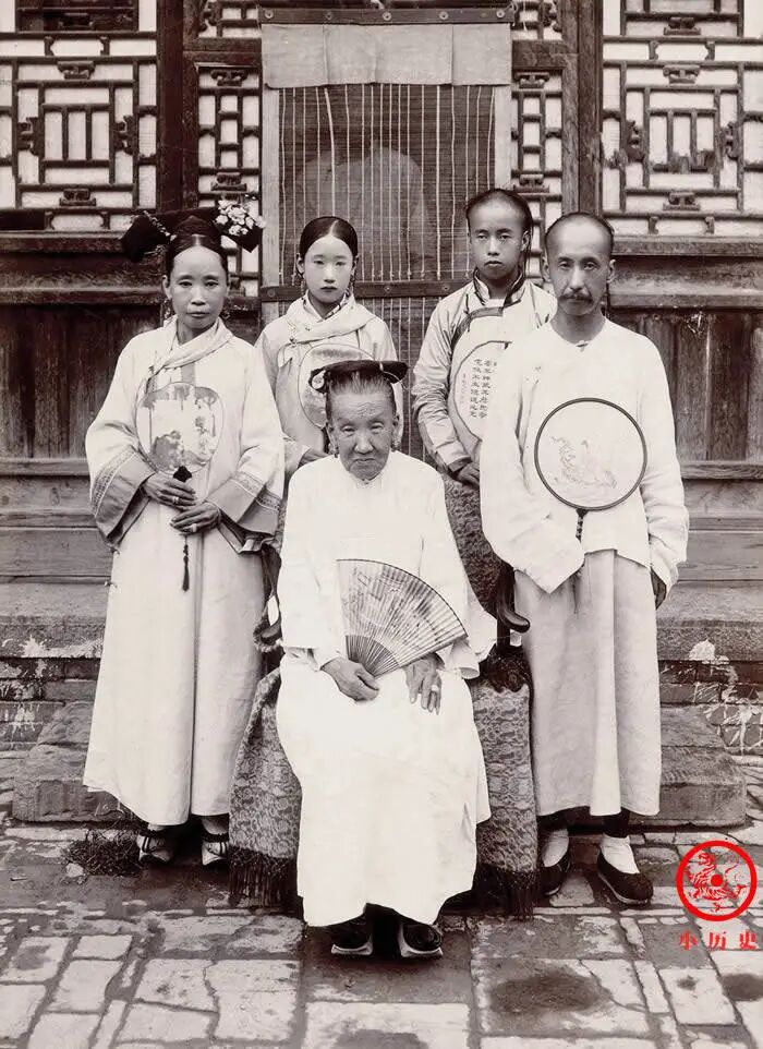 照片记录了老中青三代旗人男女的发式和服饰,五人手中分别拿着不同造型的扇子,为研究晚清旗人生活提供了珍贵的第一手资料。