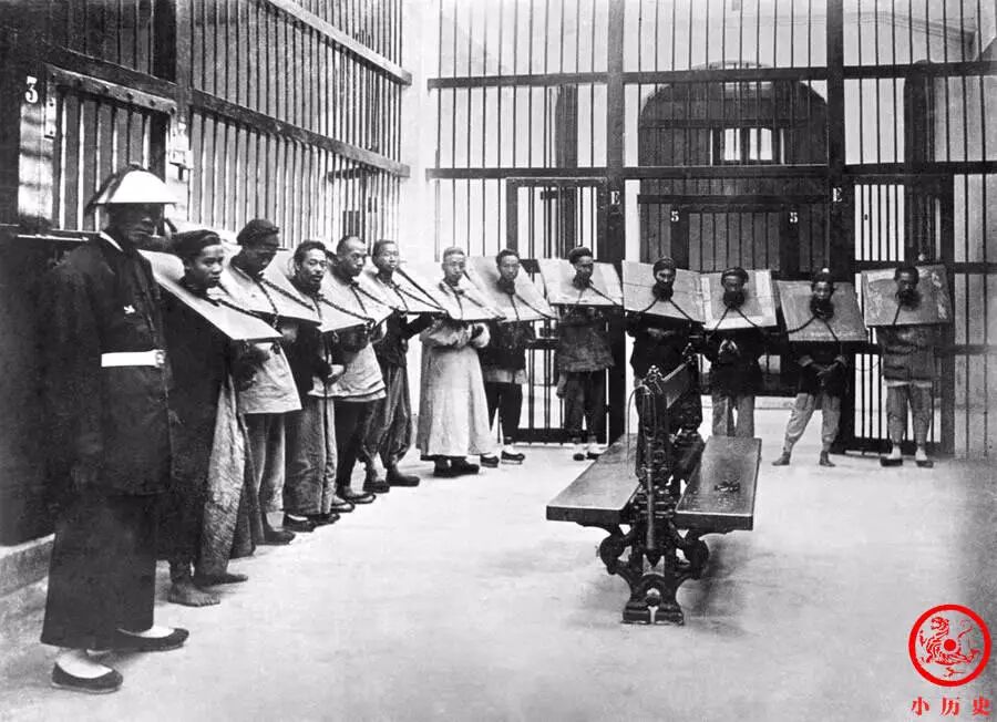 这张照片呈现了晚清监狱内景的一角,有很高的价值。犯人戴着枷板,被铁链锁牢,在狱卒的看守下插翅难逃。