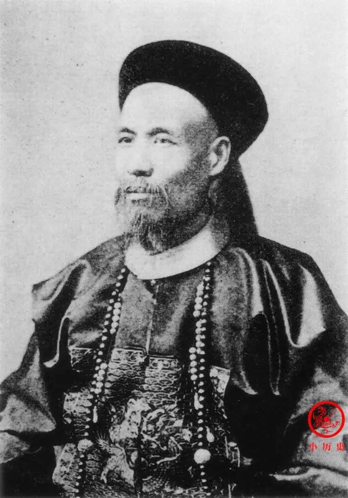 因为照片清晰度不够,我们看不清他补子上绣的是何种图案,不能准确判断他的品级。按照清朝规矩,武官四品以上可佩带朝珠,我们可推知他的品级在四品以上。