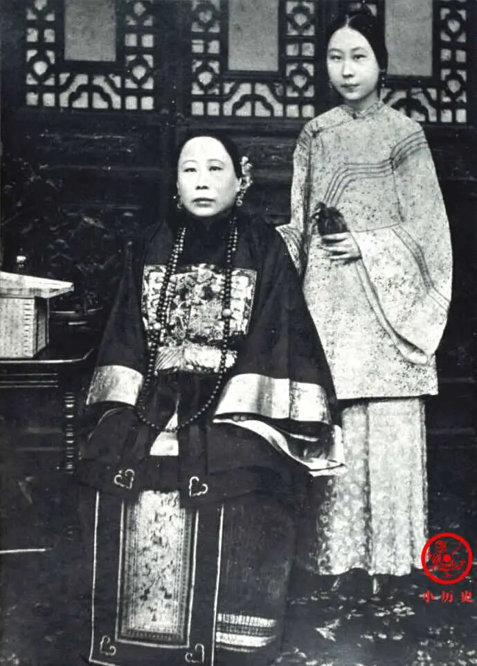 赵小莲身穿补服,显然托丈夫的福,已被朝廷封为诰命夫人。李菊藕漂亮、有气质,22岁那年嫁给左副都御史张佩纶做了继配夫人,她本人对历史没什么影响,但有一个名扬四海的孙女,即著名作家张爱玲。不过,李菊藕1912年去世,张爱玲1920年出生,二人并没有见过面。