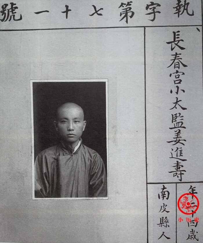 这份简单的档案包含丰富的信息,不仅贴着姜进寿的大头照,还标注了他的当差地点、籍贯、职级和年龄,为内务府下属机构敬事房对太监们进行管理的存证文件。“小太监”相当于太监队伍中的“职称”,地位较低,在此之下,只有“散差太监”更低一级。