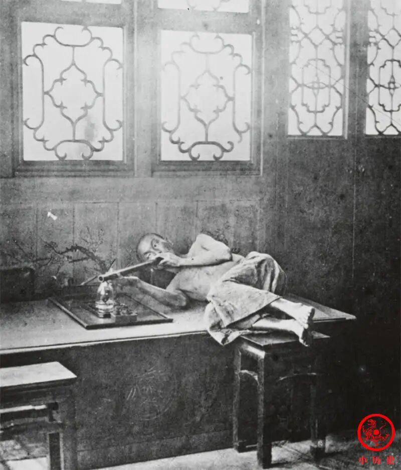 此人在鸦片烟馆里吞云吐雾,把自己变得干巴瘦弱,深陷其中不能自拔。从着装来看,他并不是大富大贵之人,为数不多的收入大部分被他消耗在了鸦片上,真是伤害自己、伤害家庭、伤害国家。