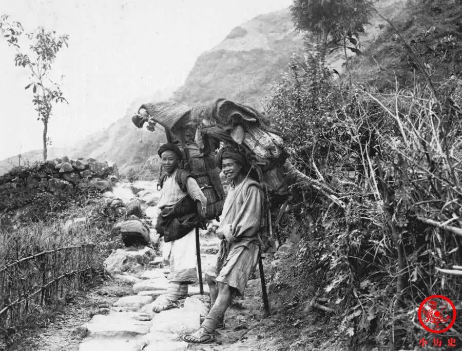 他们分别背负着一大捆草鞋,应是到人群聚集的地方售卖。在坎坷崎岖的山路上负重行走,那是相当辛苦的,但他们面露微笑,不以为苦。