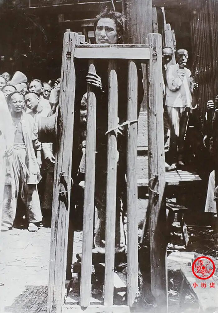 这名囚徒站在一种名为“立枷”(又称为“站笼”)的刑具里,昼夜站立,站多久要看官府判处的天数。笼口卡住脖子,他在里面无法吃喝拉撒,痛苦不堪。如果是重刑犯,他脚下的砖头将被逐渐撤出,让他悬空窒息而死。