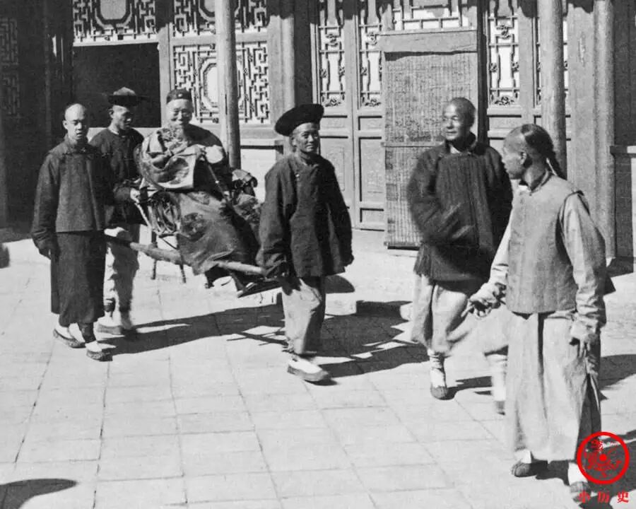 八国联军占领京津之后,慈禧太后和光绪帝一跑了之,让78岁的李鸿章担任直隶总督兼北洋大臣,与列强谈判收拾烂摊子。照片中的李鸿章老态龙钟,行走困难,出门就要由仆役抬着走。不久之后,在与列强的谈判进入尾声时,他因病去世。