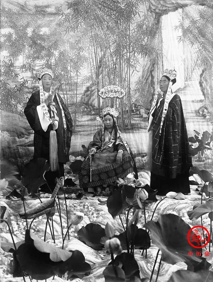 慈禧太后有扮演普陀山观音大士的爱好,因为这样能使她看上去更加慈祥。1903年她接触照相机之后,就让人把这一幕拍摄了下来。太后身边站了两位护法,均由她宠信的大太监扮演,左为崔玉贵,右为李莲英。