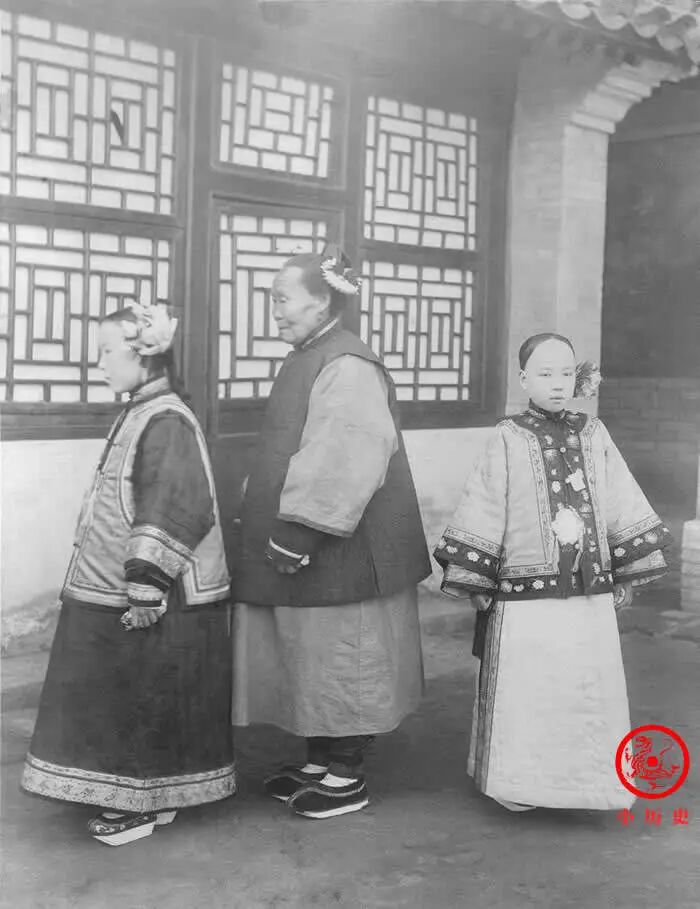 照片记录了不同年龄段三位旗人女性的身影,分别展示她们的穿着打扮,有猎奇的意味。
