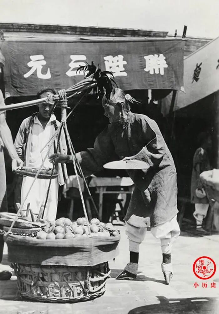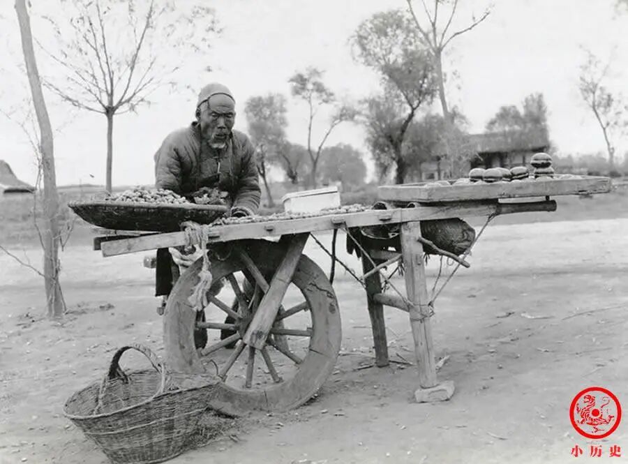 冬天,四周一片荒凉,这位老人在路边用独轮车支起摊子,做一点小本生意。花生和柿子的数量并不多,很可能是自家种植吃不完的,拿出来销售换点零花钱。这张照片是底层百姓生活实况的写照。