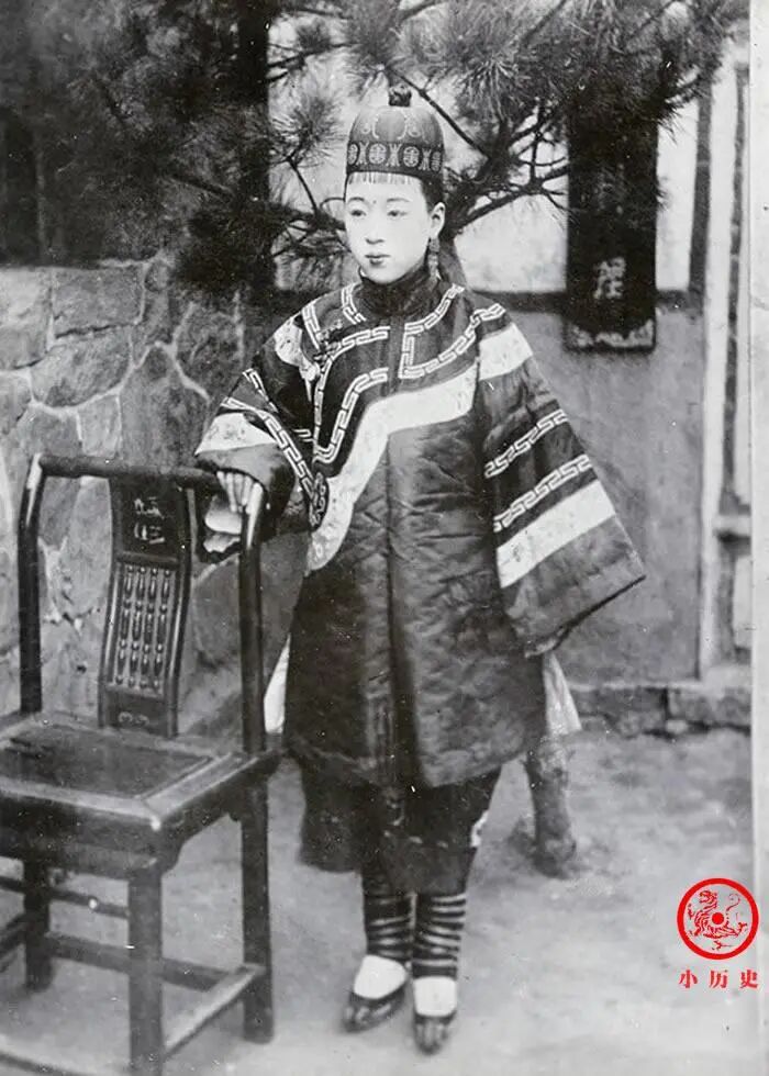 这位妇女头戴大拉翅,穿坎肩和氅衣,一副典型的晚清旗装风格。她手上戴着护指,说明她来自富贵之家,自己不用干家务活,特别讲究指甲的保养。