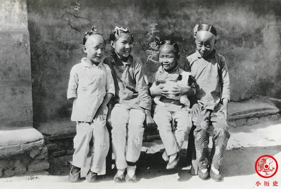 她们的发型很特别,额头剃光,再扎小辫,很有时代特色。等长大后,挽起发髻,就不再剃额头。