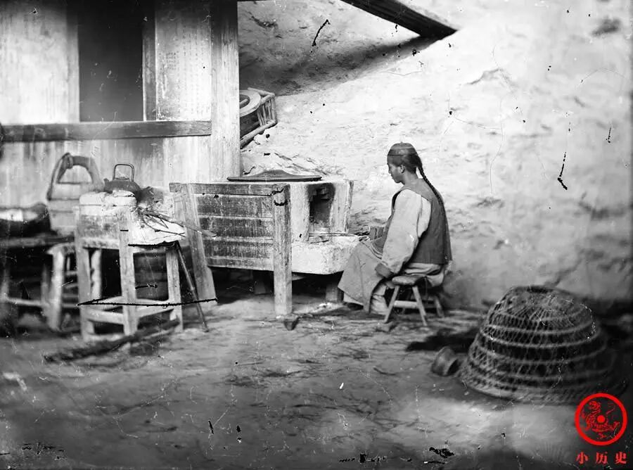 这张照片展示了晚清一户人家厨房里的场景,一男子正在烧火做饭,难得一见,充满了生活气息。这种地锅,有见过的吗?