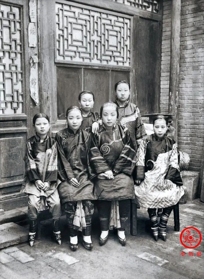 就前排四人而言,两人裹“三寸金莲”、两人留天足,这说明汉族女性不缠足的现象并不罕见。右二梳着满天星发型,非常时尚。