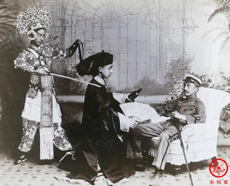 蓄辫子、穿官服的男子跪在地上,为外国军官倒酒;后面穿戏装的人一手持剑、一手撩起跪地男子的辫子,作刺杀姿势。不明白这张照片要表达什么,似乎是要羞辱跪地的男子。