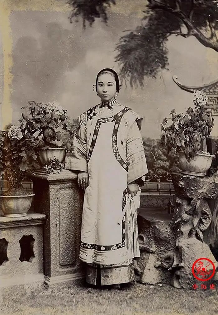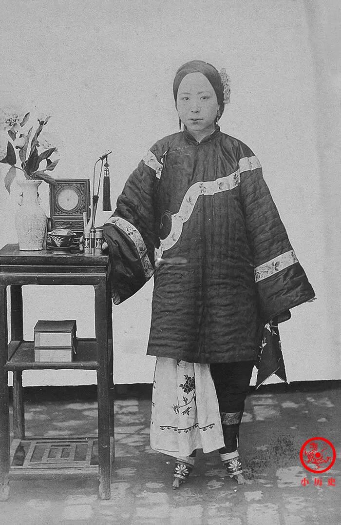 这名女子右手持烟袋,左手拿手绢,展现晚清中上阶层女子的形象。