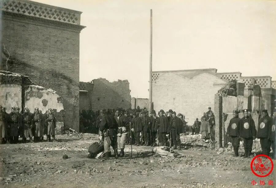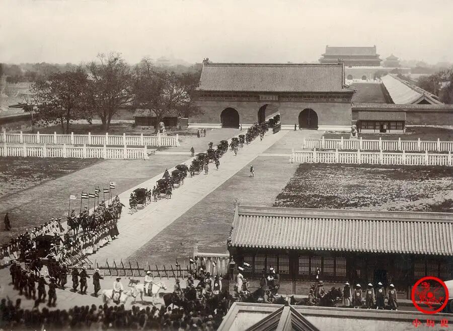《辛丑条约》签订后,列强的侵略欲望得到了满足,陆续撤出北京。照片记录了俄国军队撤出紫禁城的场景。画面中,一队清军为前导,紧随其后的俄军旌旗飞舞,自大清门浩浩荡荡地出发,颇有胜利者的姿态。