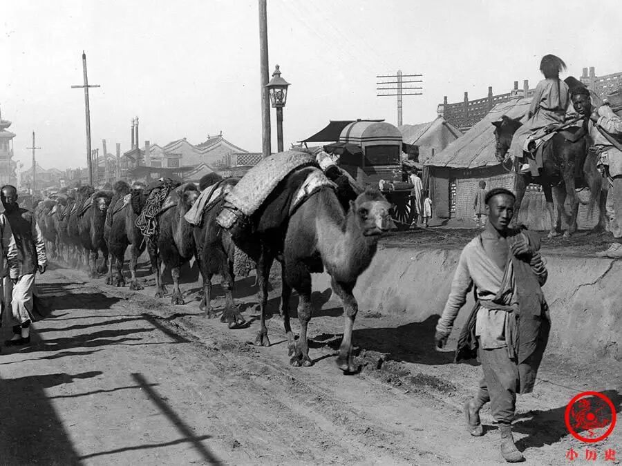 骆驼是当时重要的运输工具,老百姓的生活用品、达官贵人的奢侈品,都要靠骆驼运入城内。画面中出现了电线,这是传统与现代交融的一个场景。