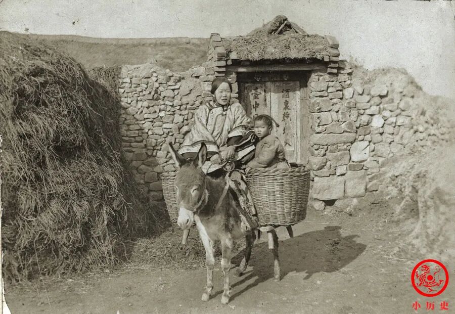 这种个头低矮的毛驴性格温顺,适合女性驾驭。她这是带着孩子回娘家吧?背后破旧的院门贴着对联:酒里乾坤大,壶中日月长。