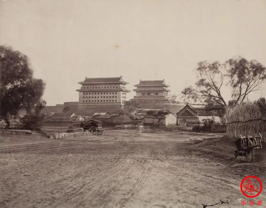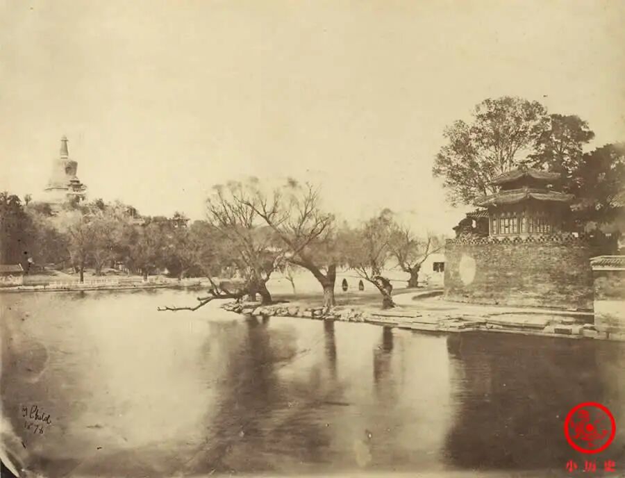 画面自左至右,可清晰地看到白塔、琼华岛、堆云积翠桥、团城。这张照片是目前已知北海最早的影像之一。北海虽然是著名的皇家园林,但看照片记录的场景,给人一种死气沉沉的感觉。
