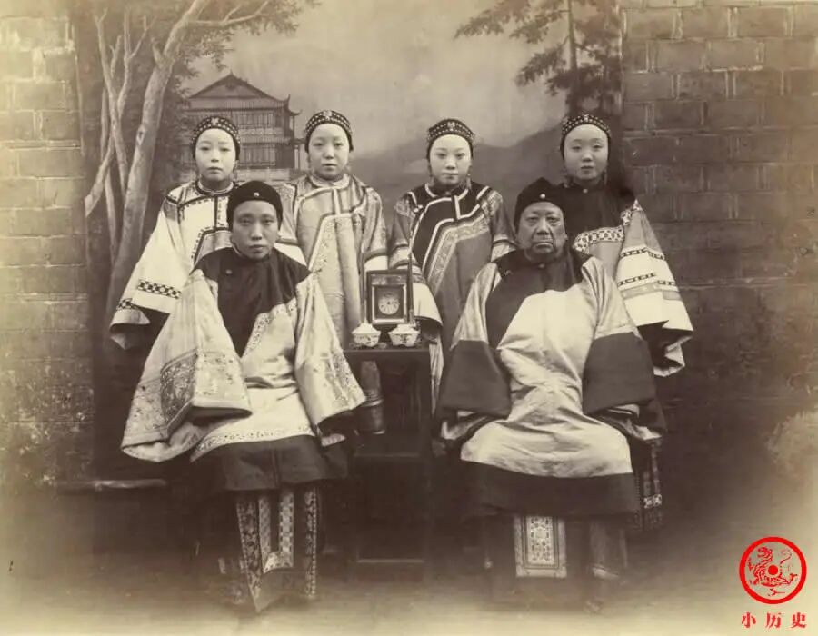 这张照片记录了一个传统家庭的三代女性。前排两人都坐着,表情严肃,其位置体现了“左尊右卑”的原则;后排年轻女性打扮精致,神态拘谨。它不仅反映出传统家庭的长幼尊卑秩序,还反映着当时女性的精神面貌和服饰妆发。