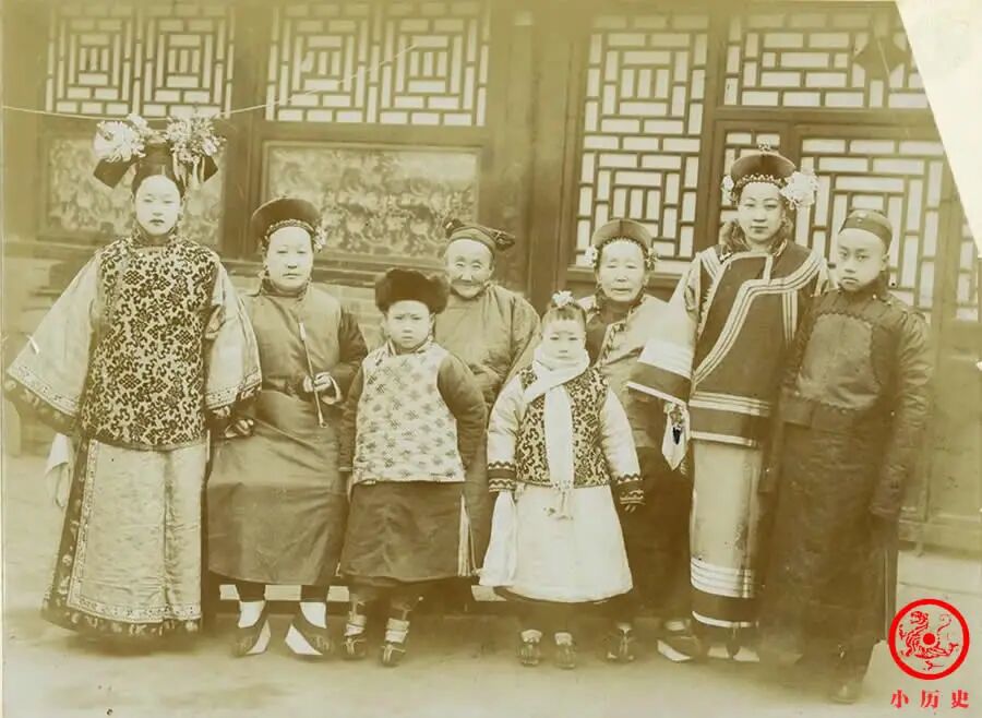照片中大人、孩子都穿着华美的传统服饰,可见对此次拍摄的重视。那个年代拍一次照片不容易,大家无不是把压箱底的衣服拿出来穿上,郑重其事。
