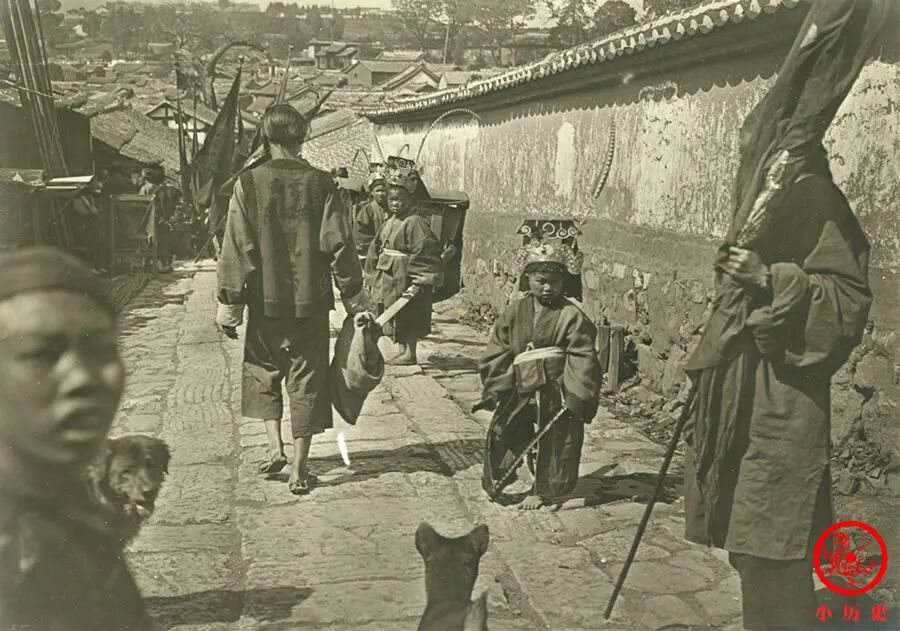 照片拍摄的是巡抚大人出行仪仗的后半段,队列非常散乱,背对镜头的兵丁号衣上写着“云南巡抚部院亲兵”。那几个赤脚的孩子不知充当了什么角色?当时在任的云南巡抚是丁振铎。