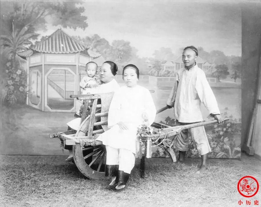 这张照片是在照相馆中摆拍的民俗风情,集独轮车、仕女、小脚、孩童等多个题材于一体,在手绘的背景板前设计出一幅妇女携子出行的场景。