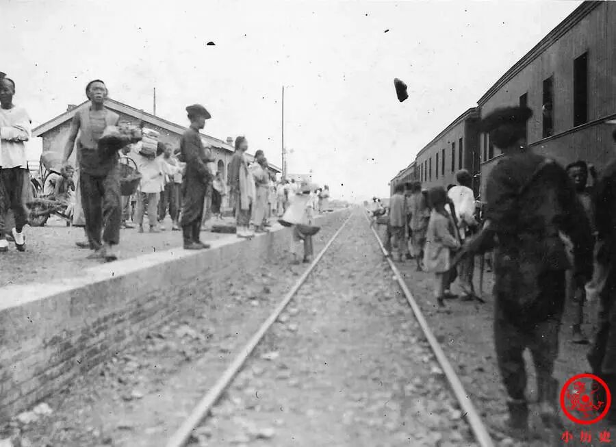 邯郸站建于1903年4月,于1904年投入运营,是卢汉铁路(卢沟桥至汉口)上的几个主要大站之一。我们从画面中看到,车站秩序不佳,很多商贩跳下站台,向车内乘客兜售商品。